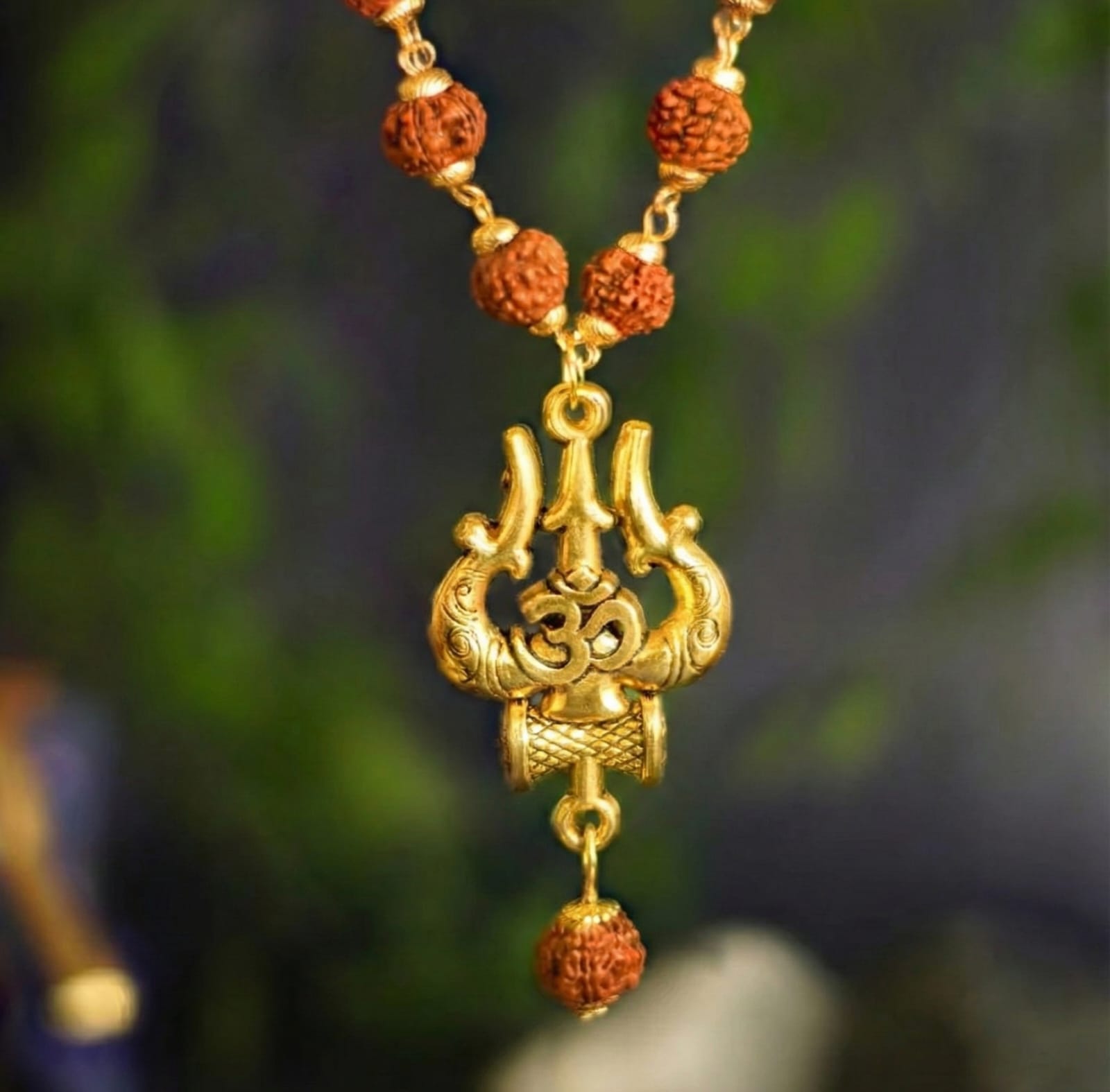 Gold Plated Rudraksha Om Trishool Necklace crafted for protection, peace, and spiritual strength. Ideal for daily devotional wear.